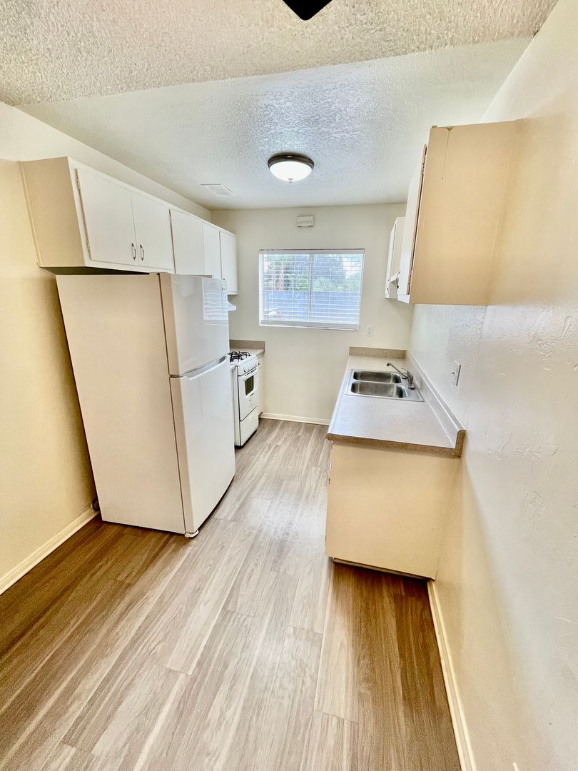 WOW! Take a look at this rare availability! Beautiful large lower 1 bedroom, 1 bathroom unit with NEW gorgeous vinyl plank flooring, carpet, and paint. The living room area is perfectly spacious for relaxing with wall air conditioning. Beautiful kitchen with tons of cabinets and equipped with stove and refrigerator. Complex amenities include an onsite laundry facility, onsite-manager, and 1 assigned parking space. Close distance to shopping, grocery, and restaurants.